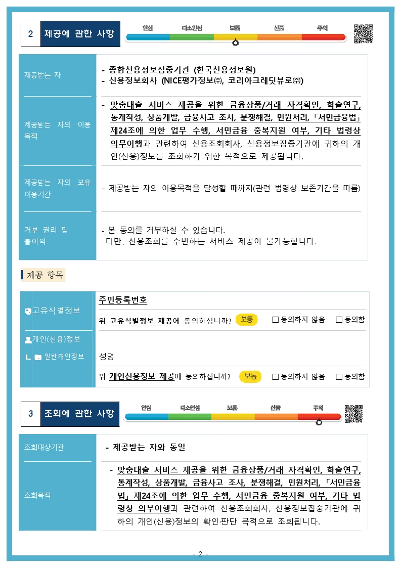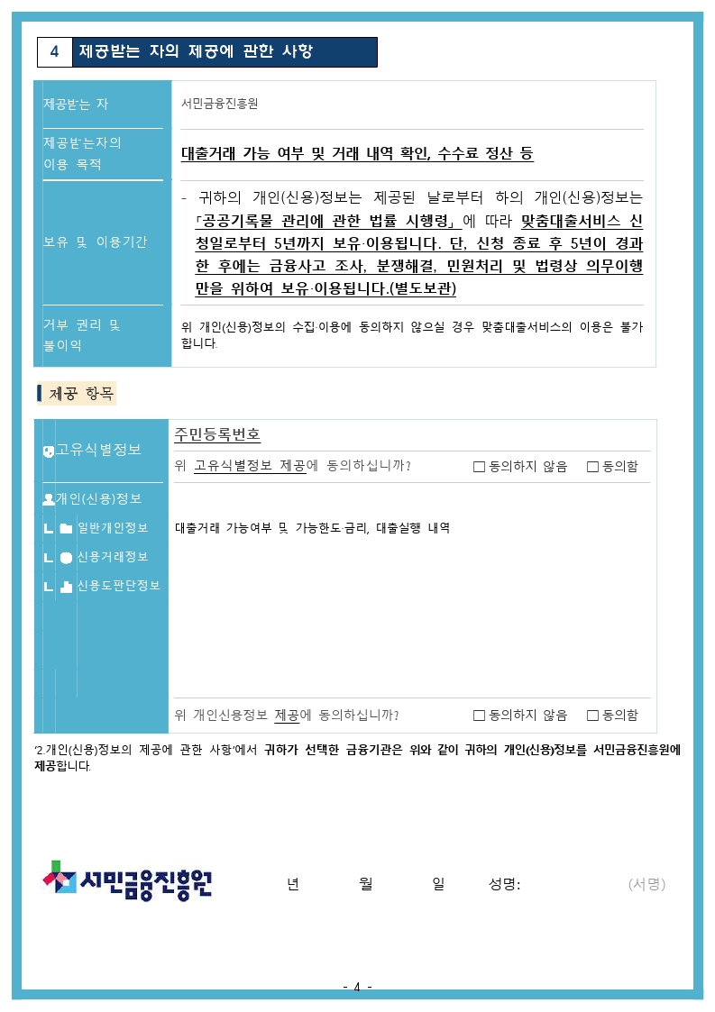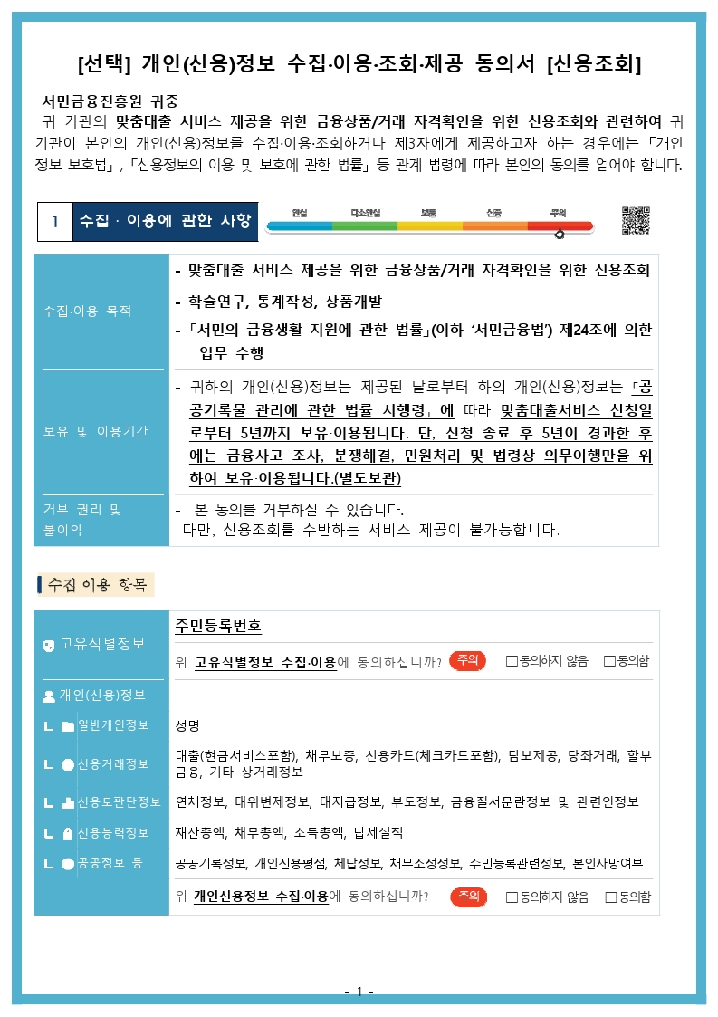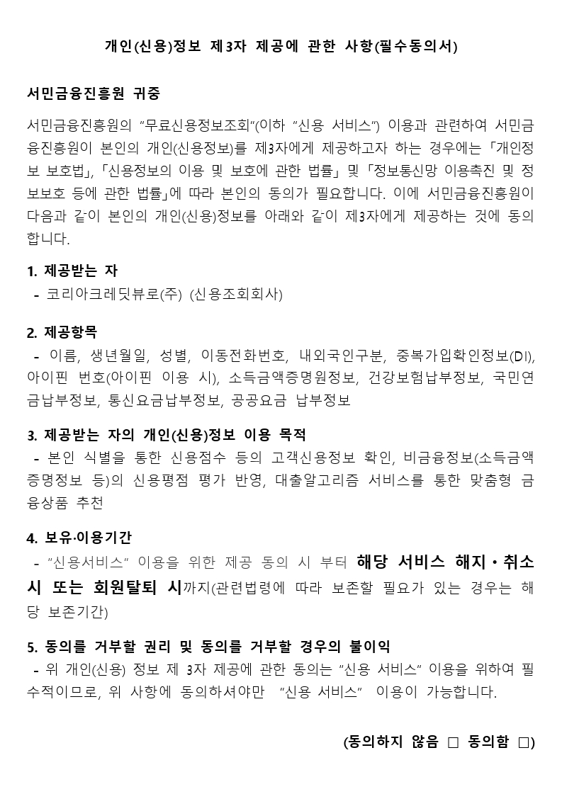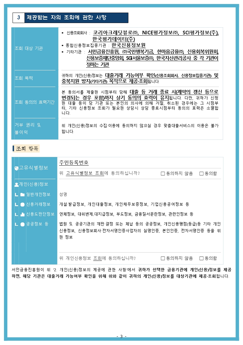 - 대출가능여부, 한도, 금리 등의 대출 조회결과와 대출실행은 각 개별 금융회사가 결정하며, 서민금융진흥원은 대출조회 결과에 대해 어떠한 판단 또는 결정을 하지 않습니다.