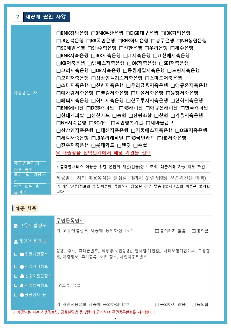 - 맞춤대출을 통해 입력한 고객님의 정보를 기반으로 금융회사에서 대출 가조회 결과를 제공하며, 입력하신 정보와 실제 서류 상의 정보가 다를 경우 대출 결과가 변경되거나 부결될 수 있습니다.